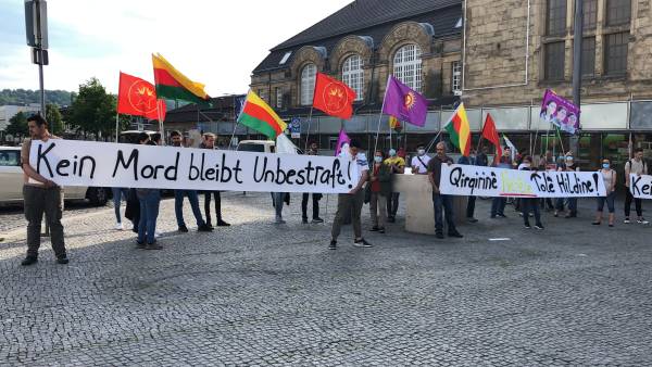 Десятки курдов собрались перед железнодорожным вокзалом Билефельда, чтобы осудить расистское нападение на Барыша Чакана, которого четыре дня назад в Анкаре зарезали турецкие фашисты за то, что он слушал курдскую музыку.