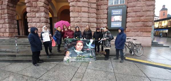 В Майнце женщины собрались вместе на Гутенбергплатц с фотографиями убитых Джансыз, Доган и Сайламаз.