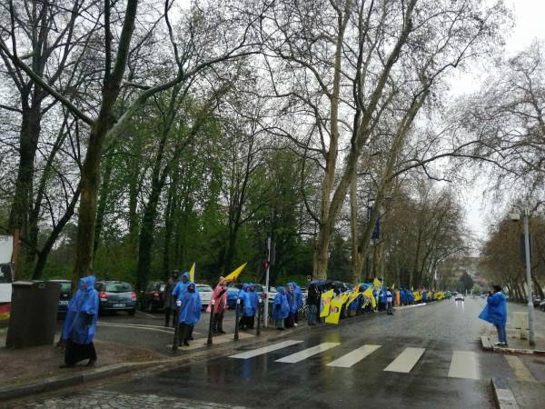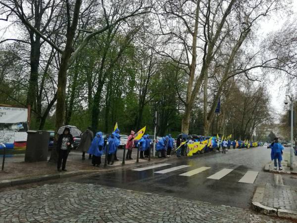 После марша под проливным дождем активисты выстроились в живую цепь – таким способом демонстранты хотели привлечь внимание к голодовке.