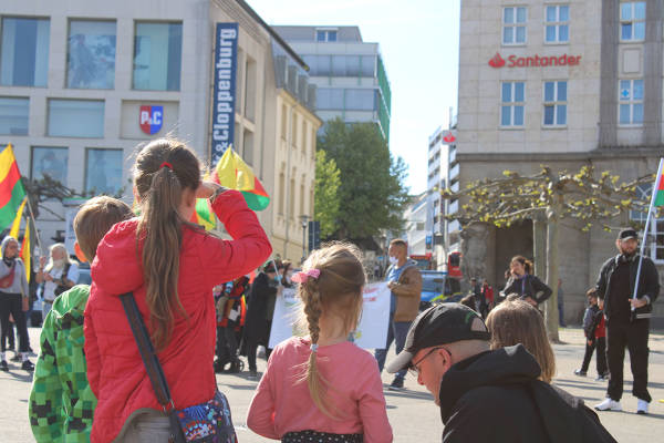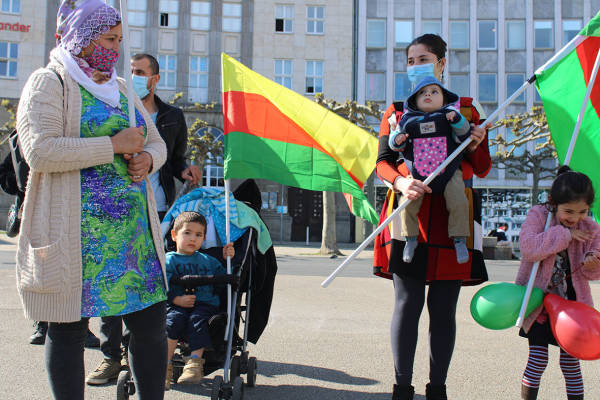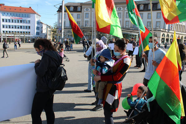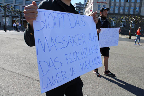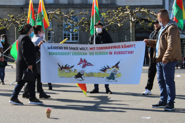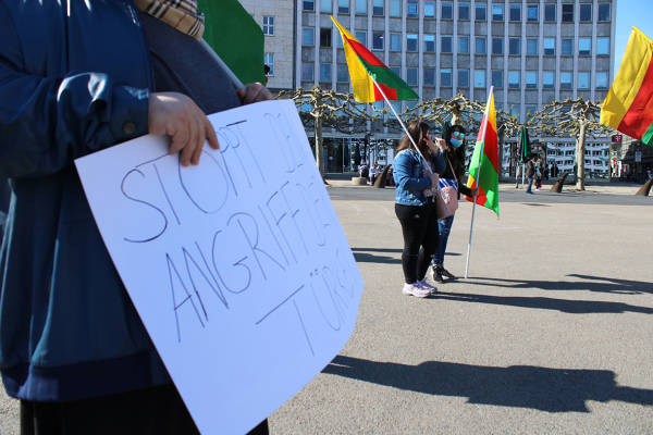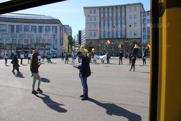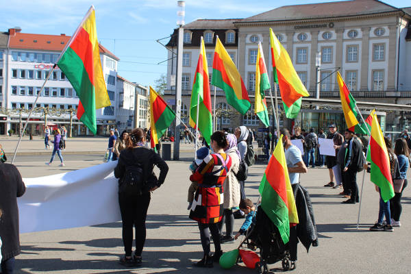 Десятки людей собрались на площади Кенигсплац в немецком городе Кассель, чтобы выразить протест против нападений Турции на курдский лагерь беженцев в Махмуре в южном Курдистане, северный Ирак. 15 апреля три мирных жителя были убиты в результате нападения турецких боевых беспилотников, когда они пасли своих животных. Военные самолеты пролетают низко над лагерем, тревожа население.