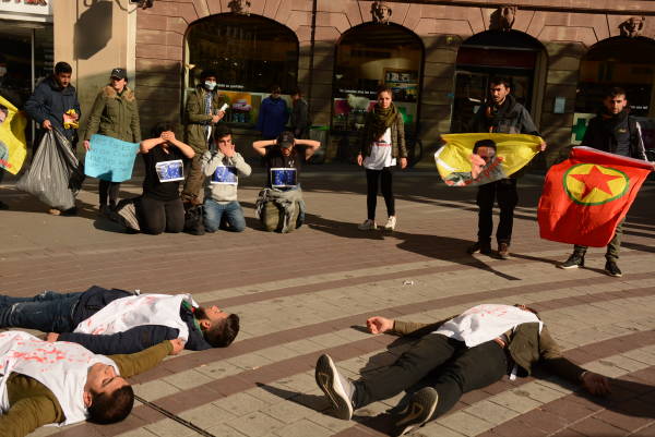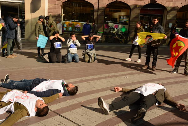 Четыре активиста надели фартуки, залитые красной краской, чтобы привлечь внимание к массовым убийствам курдов со стороны турецкого государства. Таким образом молодежь дала понять, что молчание перед лицом изоляции убивает. Активисты закрыли глаза, уши и рты в знак протеста против политики Комитета по предупреждению пыток (КПП) и европейских учреждений. Активисты, скрывая свои чувства, надели флаги ЕС на свои лица.