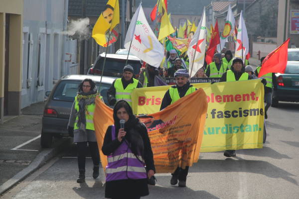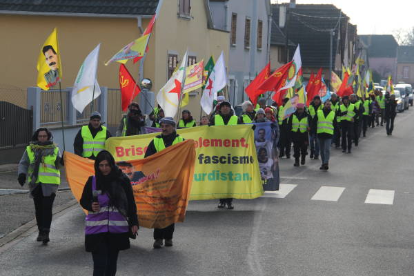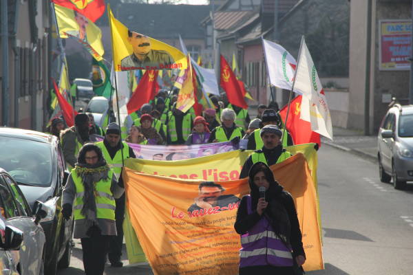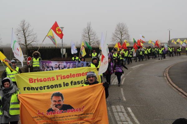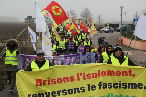 Члены партии «Демократический союз», возглавившие марш во вторник, выступили с лозунгом «Прекратим изоляцию, уничтожим фашизм и освободим Курдистан!»