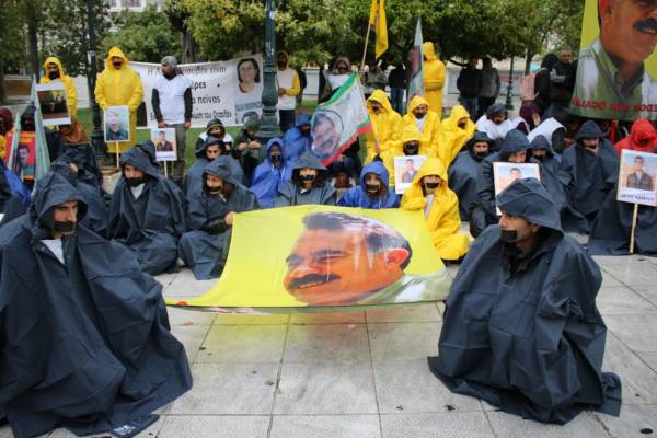 Надпись на другом плакате гласила: «7000 курдов участвуют в голодовке в знак протеста».