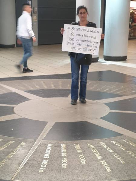 Продолжается кампания по вывешиванию плакатов, начатая в Германии в четверг, чтобы привлечь внимание к голодовке 7000 заключенных.