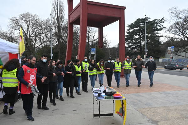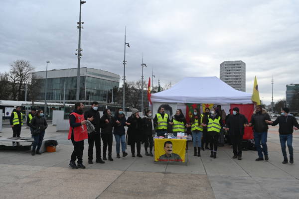 На митинге были зачитаны заявления на французском языке и выражена солидарность с сопротивлением, которое проводится в тюрьмах. Активистки Движения женщин Курдистана в Швейцарии (ДЖК-Ш) собирали подписи под заявлением акции «100 причин преследовать диктатора».